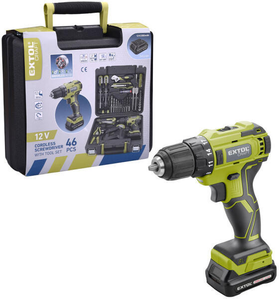 Extol Craft akkus fúrócsavarozó, 12V 1x2, 0Ah 46 db szerszámkészlettel kofferben (422801)